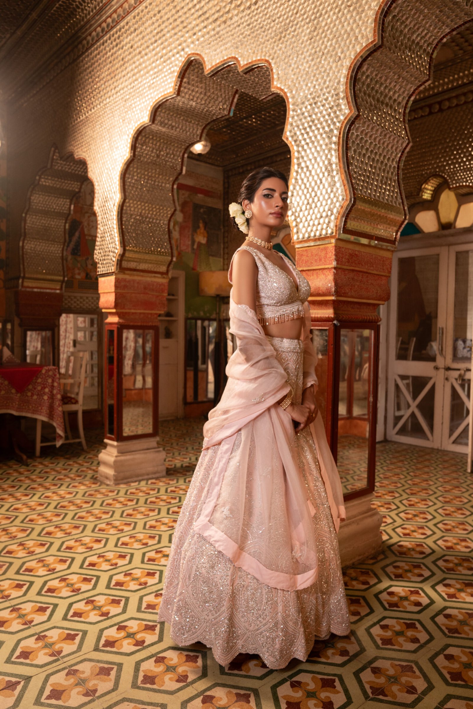 Featuring Blush Pink Pure Silk Hand embroidered lehenga paired with Silk Embroidered blouse and Organza Dupatta.