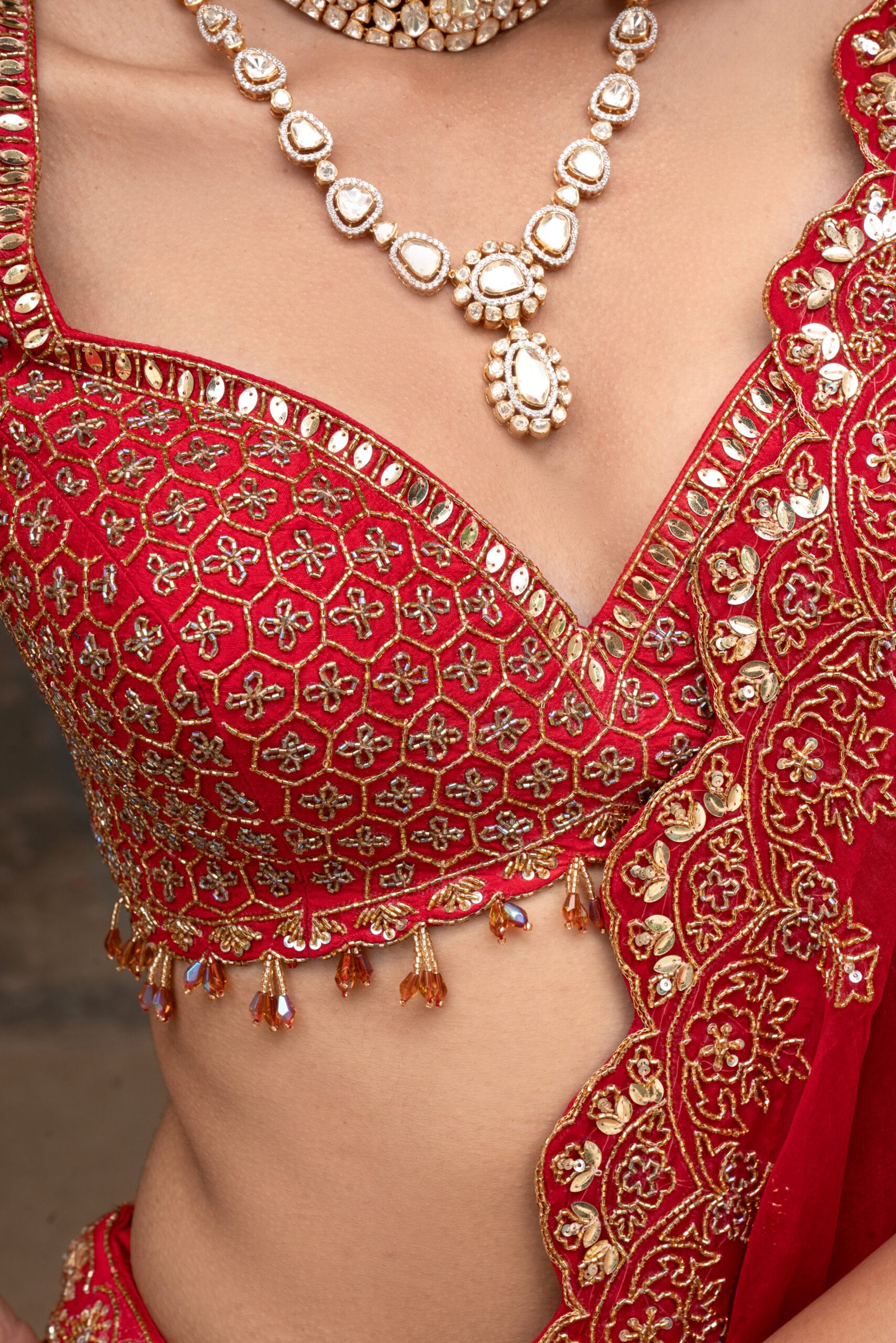 The lehenga is paired with a hand-embroidered blouse, meticulously embellished with cut dana detailing that enhances its rich texture and refined shimmer. Designed to complement the lehenga flawlessly, the blouse adds structure and modern grace to the ensemble.