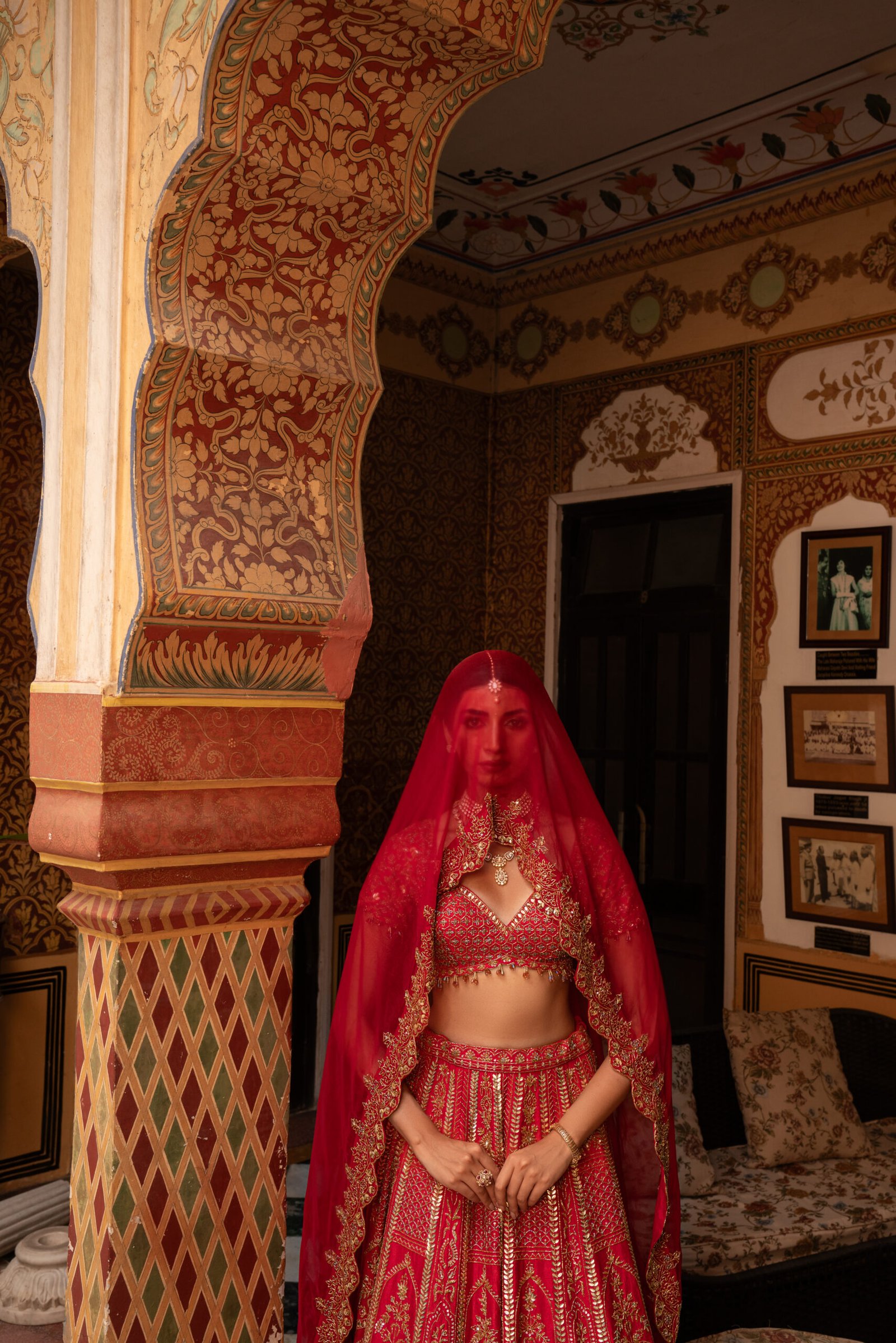 Unveil timeless glamour in this mesmerizing garnet red lehenga, exquisitely adorned with very intricate sequin and cut dana hand embroidery, crafted over an impressive 2900 hours. Every element of this piece is a celebration of traditional craftsmanship, fused with contemporary elegance to create a look that is both regal and radiant.